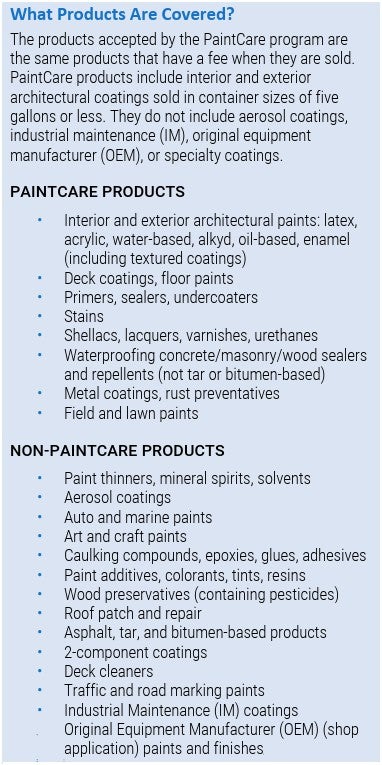 - More than just paint: The program also takes products like stains, shellacs, varnishes, urethanes, waterproofers, and rust preventers or converters.